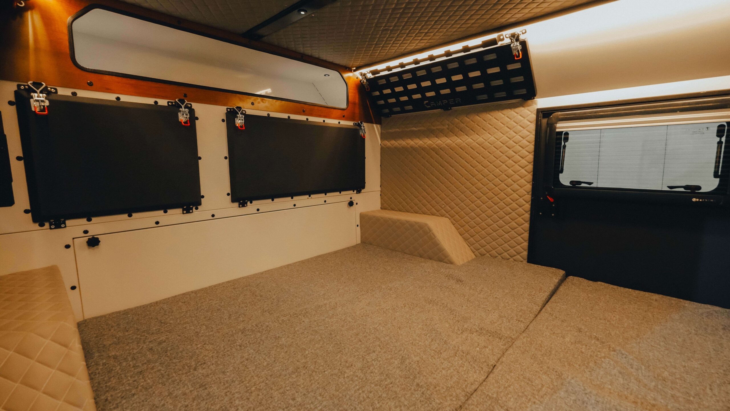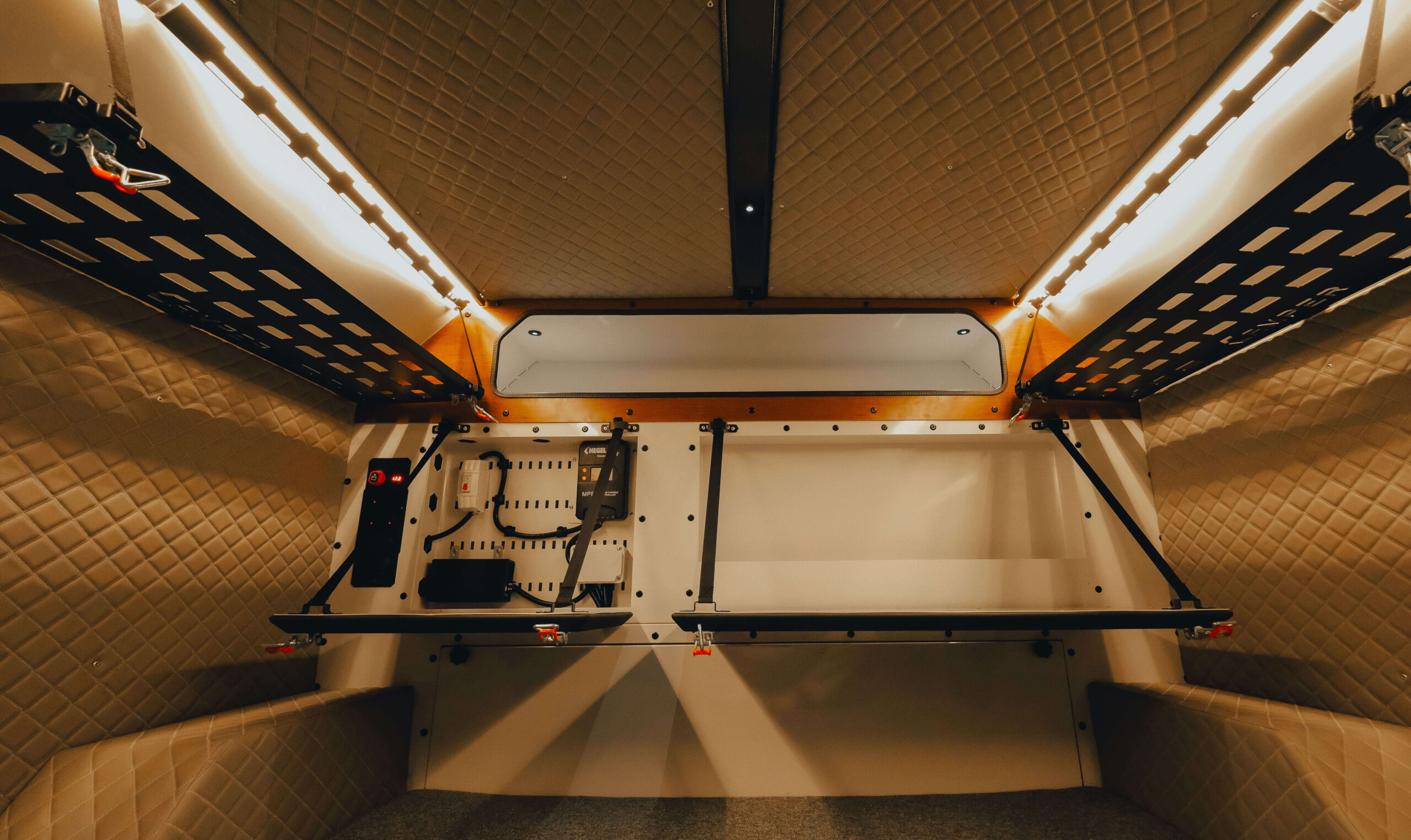 Elektrik Donanımı: 220V prizler, USB girişleri ve kamp şarj soketi.